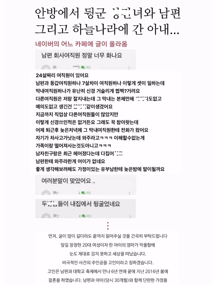 18년 7월 남편의 첫 번째 외도를 알게된 때부터 이 끔찍한 비극이 시작됐습니다.